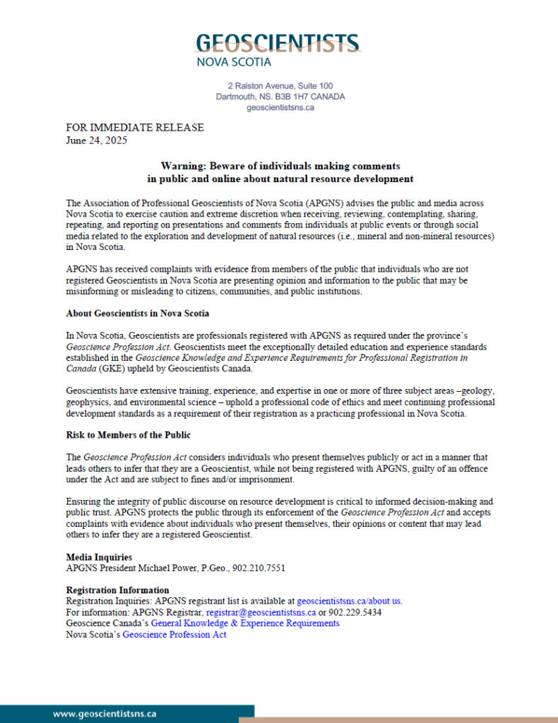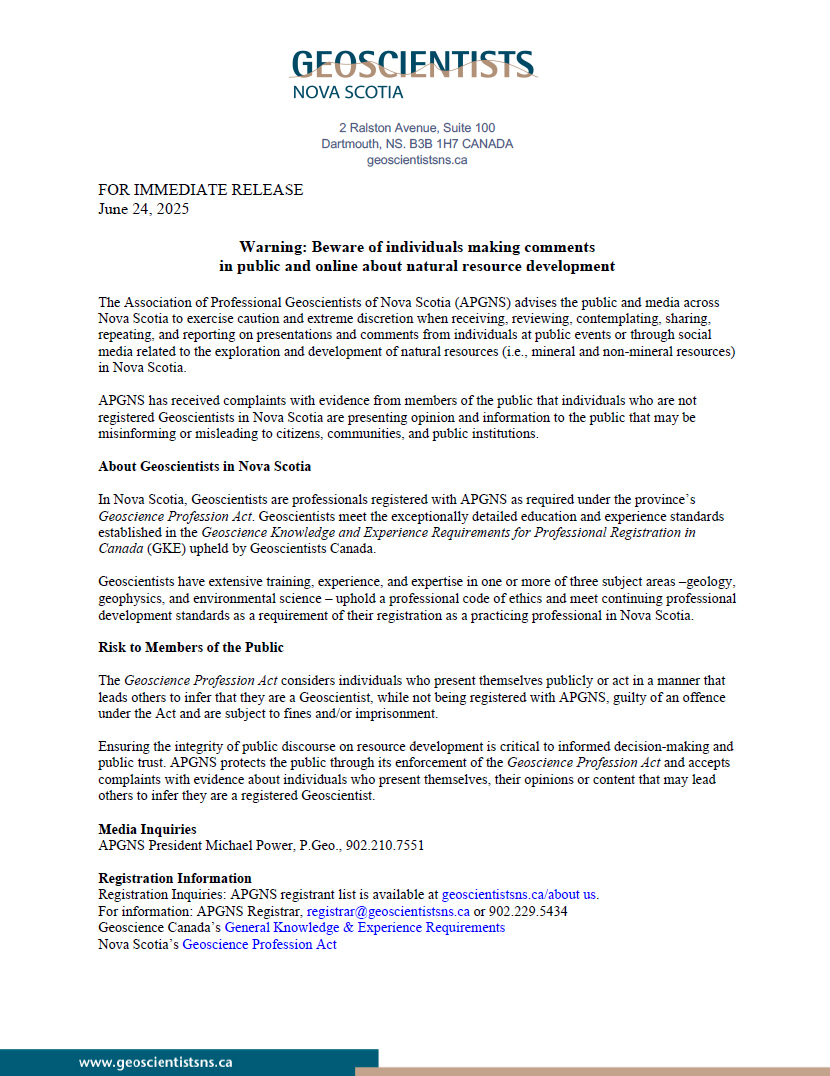 APGNS is the licensing body which fulfils this mandate by ensuring high standards of geoscience practice and education in Nova Scotia, by setting high standards for admission into the profession, by disciplining geoscientists who fail to uphold the profession’s practice and ethical standards, and by preventing the misuse of the title “geoscientist” by individuals who are not licensed members of the profession.